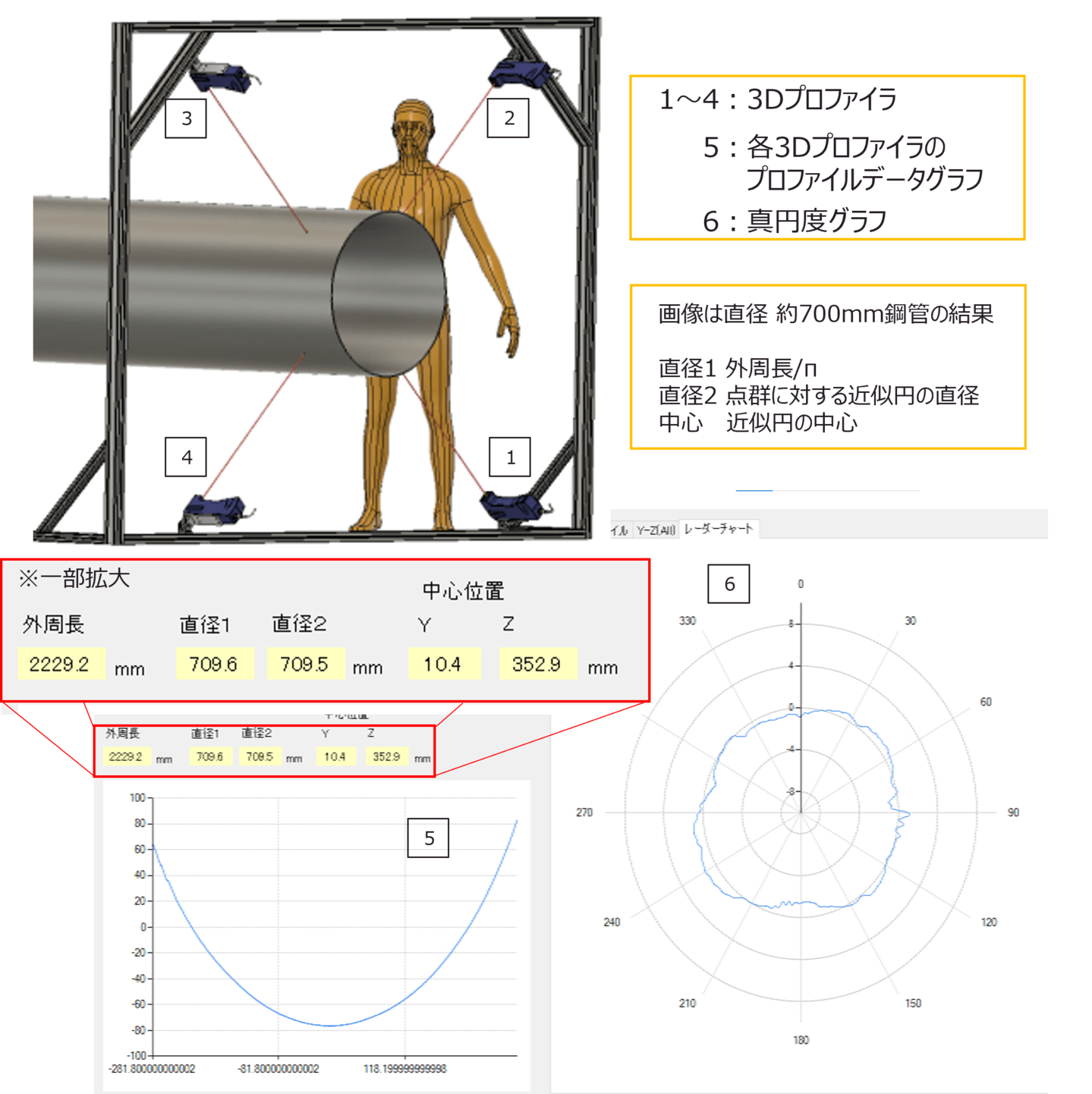 - 複数の3Dプロファイラを用いたインライン計測でリアルタイム(250ms毎)に外周長や真円度を計測