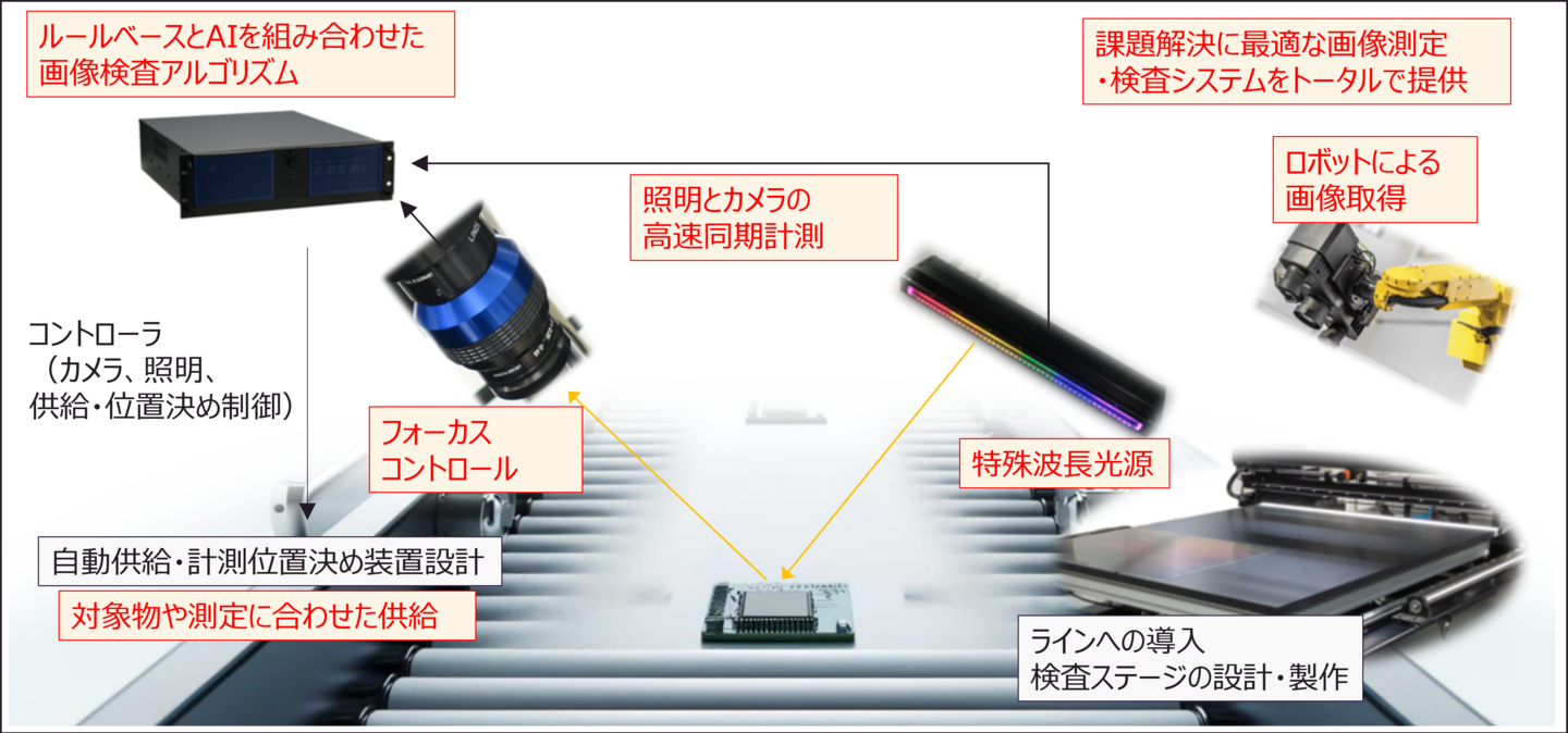 汎用画像計測装置では難しい計測課題に対して、最適な「カメラ」「照明」「供給装置」「画像検査アルゴリズム」をシステム化し、ハードウェアとソフトウェアのトータルでソリューションとして提供します